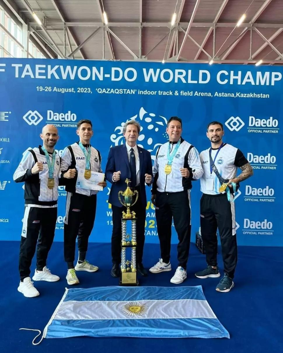 En la edición 22 del Campeonato Mundial de taekwondo ITF que se disputa en Astana, Kazajistán, Argentina logró ubicarse en lo más alto del podio. Entre los representantes “albicelestes” hubo protagonistas tucumanos que aportaron al logro. Enrique Romero y Emilio Castillo (cuarto y quinto en la foto) fueron los taekwondistas que formaron parte del equipo argentino que se completó con Matías Ríos Olivera de Santiago del Estero y Pablo Marciano de Buenos Aires. El cuarteto fue campeón mundial en la especialidad formas superando a Rusia, Inglaterra y Puerto Rico.