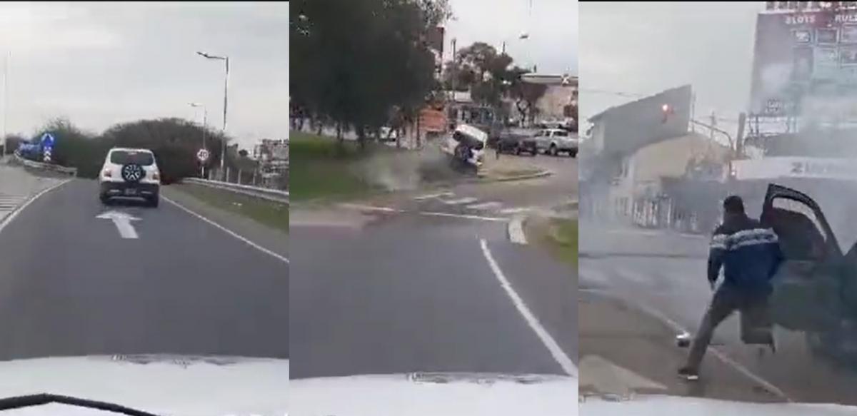 Después de dos minutos, el vehículo de los delincuentes chocó contra el cordón de la vereda provocando un choque contra una camioneta Hilux gris. En medio de la humareda desplegada por el impacto, ambos delincuentes se bajaron corriendo en orientaciones diferentes. El vehículo que filma sigue de cerca a uno de los malhechores que lleva un buzo azul con líneas blancas.
