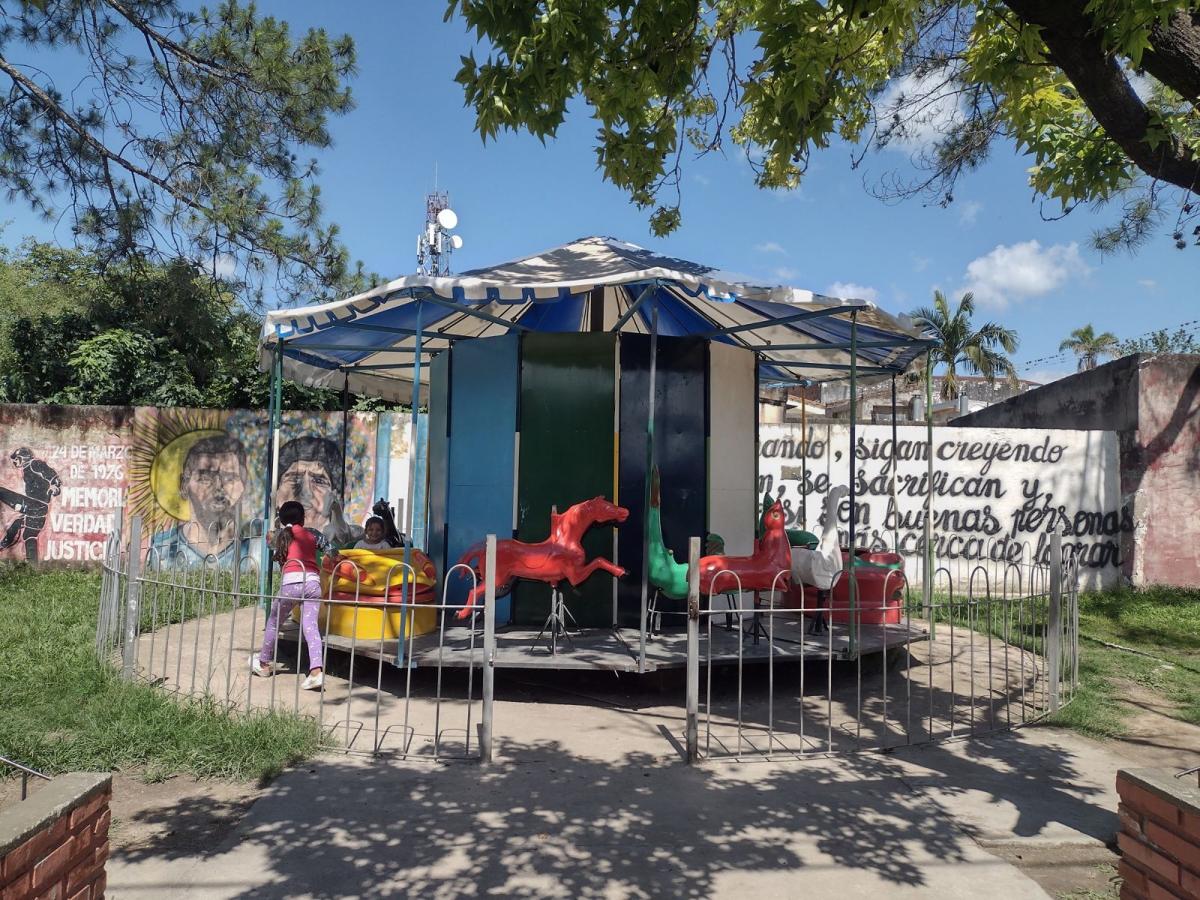 Es una creación perfecta entre los personajes coloridos que disponen los niños para subir y girar sin parar, sabiendo que no hay límites de vueltas, porque somos los padres que los impulsamos a la calesita a girar y dar vueltas, para sentirnos bien al observar las sonrisas de nuestros hijos. No se realizó acto alguno de su colación, solo se efectuó el trabajo para la diversión de los chicos. Es un hecho histórico para la ciudad que de las tantas plazas del casco urbano una se destaque por poseer un carrusel.