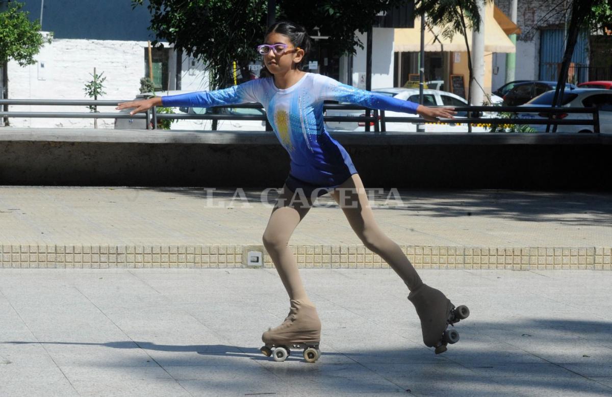 Mamá, papá y abuela esperan junto a Sol Orellana en la plaza principal de Alderetes. El cielo luce un celeste inmaculado como el traje de la patinadora artística de 10 años que, con timidez, se acerca al playón donde posará para las fotos. El volumen bajo de su voz, y su sonrisa, dejan en claro su nerviosismo mientras se dirige a una pista improvisada, que si bien no es la del club San Martín, tiene un espacio acorde para ensayar unos saltos.