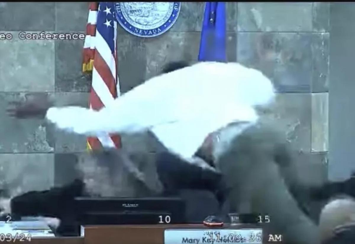 La jueza Mary Kay Holthus del Condado Clark, Las Vegas (Estados Unidos), fue víctima de un violento ataque mientras pronunciaba la sentencia de un acusado. El incidente, capturado en video, muestra al acusado Deobra Redden, de 30 años, saltando sobre el estrado y aterrizando sobre la jueza.