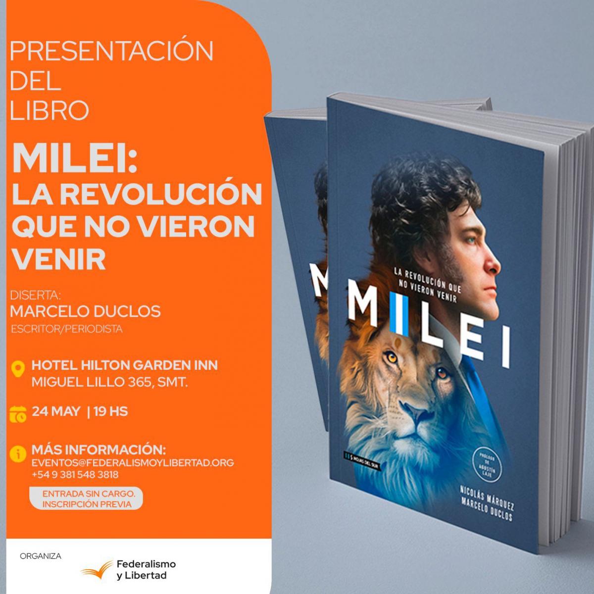 En Tucumán se realizará la presentación del libro “Milei: La revolución que no vieron venir”. El encuentro se anunció para el 24 de mayo en el Hotel Hilton Garden Inn y estará a cargo de uno de los autores del libro, el periodista Marcelo Duclos.
