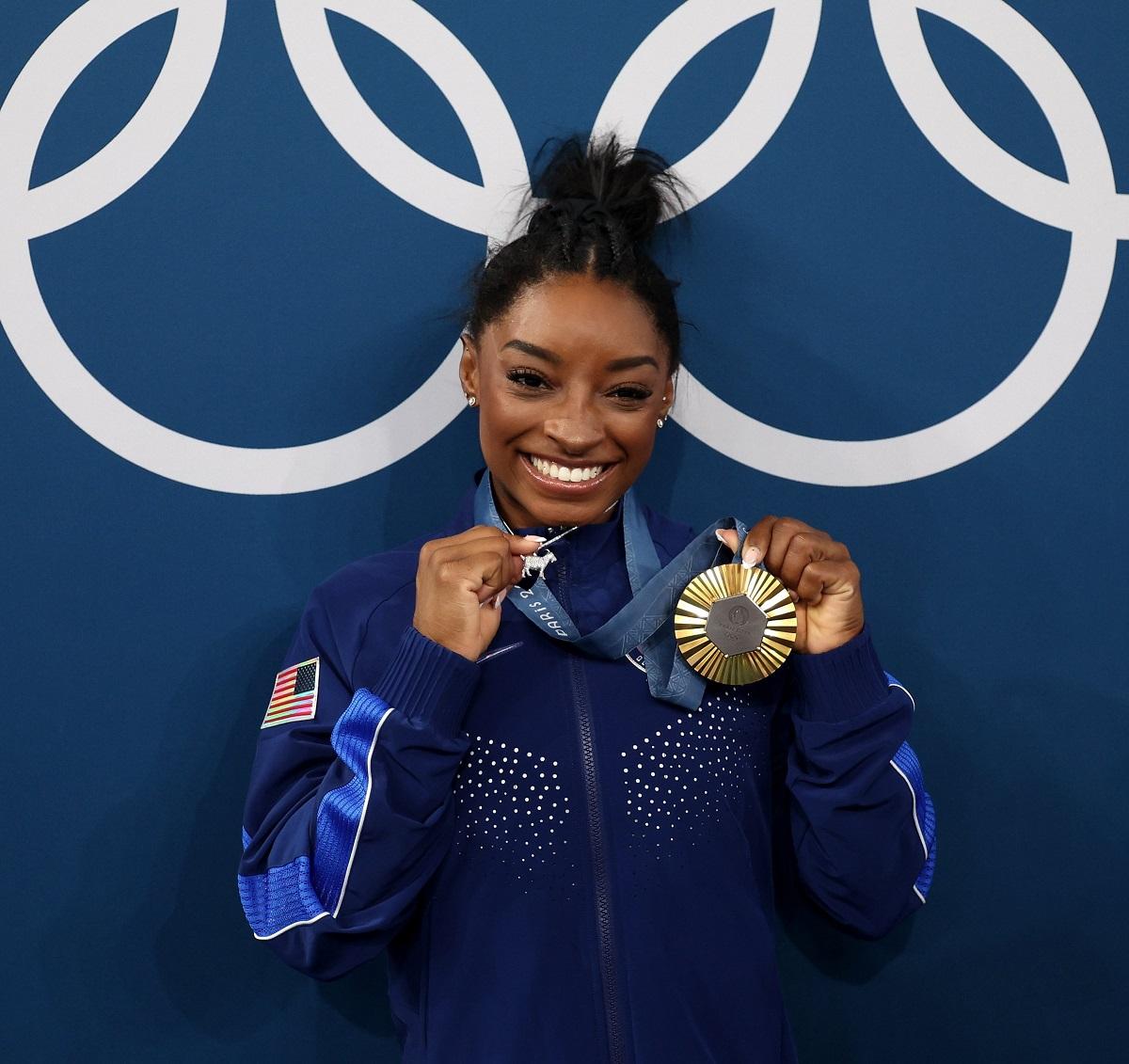 FELIZ. Simone Biles posa junto a la sexta medalla dorada que logró en su carrera.