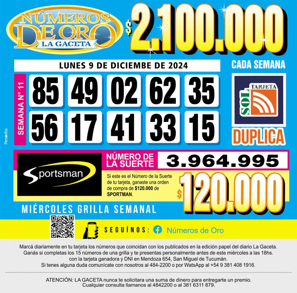Los Números de Oro de LA GACETA del lunes 9 de diciembre de 2024