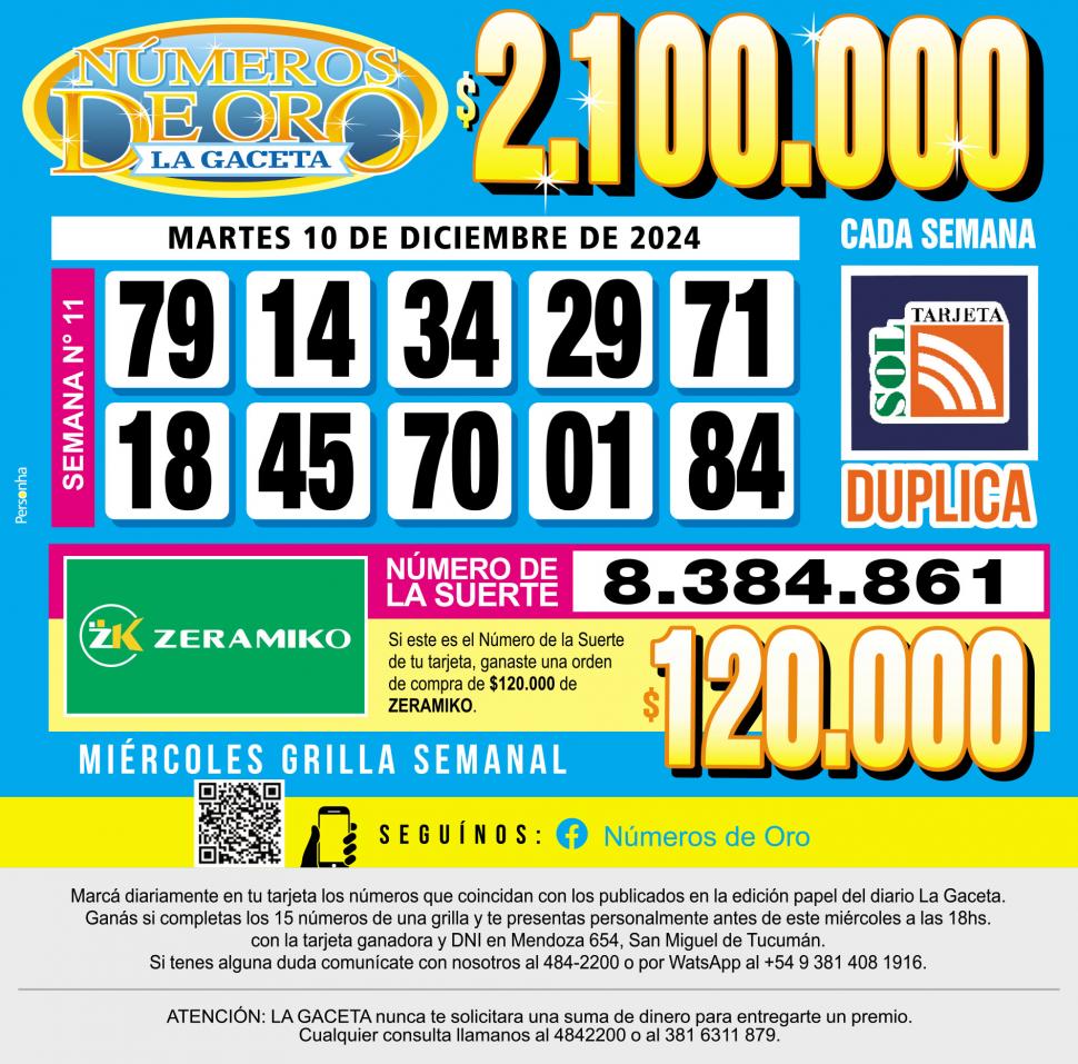 Esta es la grilla completa de los Números de Oro de LA GACETA del 17 de diciembre de 2025