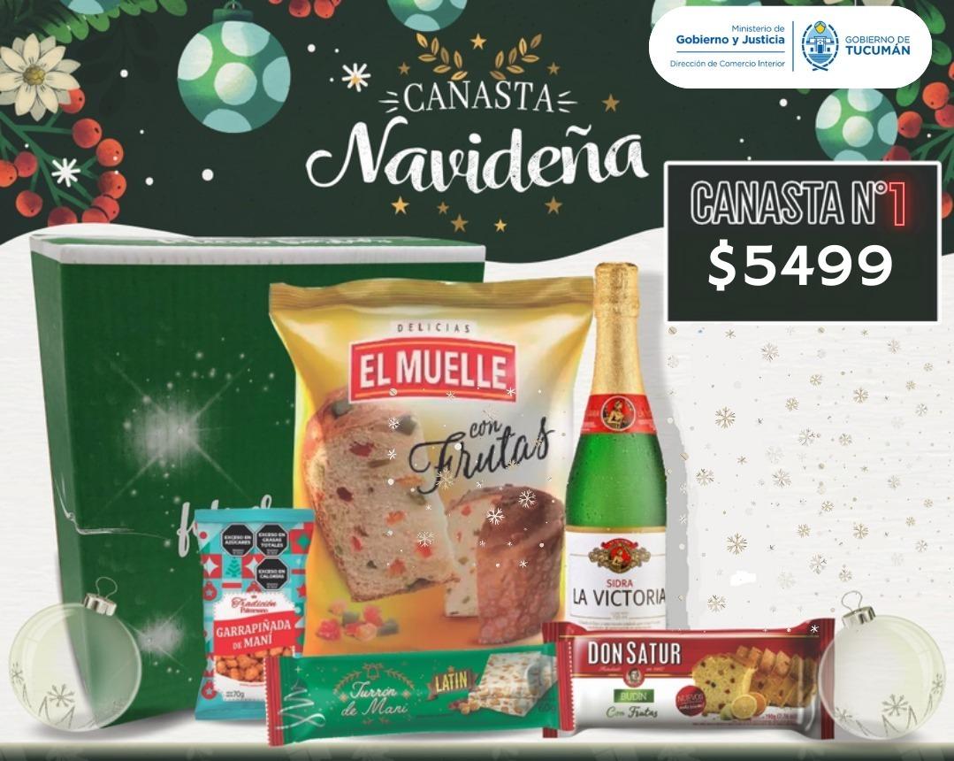 - Canasta de 5 unidades ($5.499): sidra, pan dulce, turrón, budín y garrapiñada.
