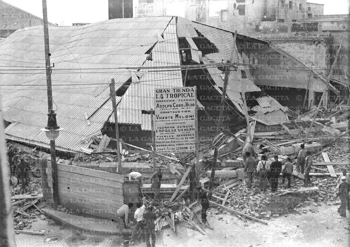 La imagen muestra obreros y curiosos que llegaron hasta la ochava noroeste de Muñecas y Mendoza para ver -y arreglar- lo que había ocurrido. Fue el 18 de agosto de 1943 cuando se estaba construyendo la tienda “La Tropical” y sorpresivamente se vino abajo. Tras las reparaciones por el desastre, la Tropical reinó en ese lugar. Luego, a partir de 1978, la “perla” de esa esquina y hasta estos días es otro negocio del mismo rubro: Tienda San Juan.