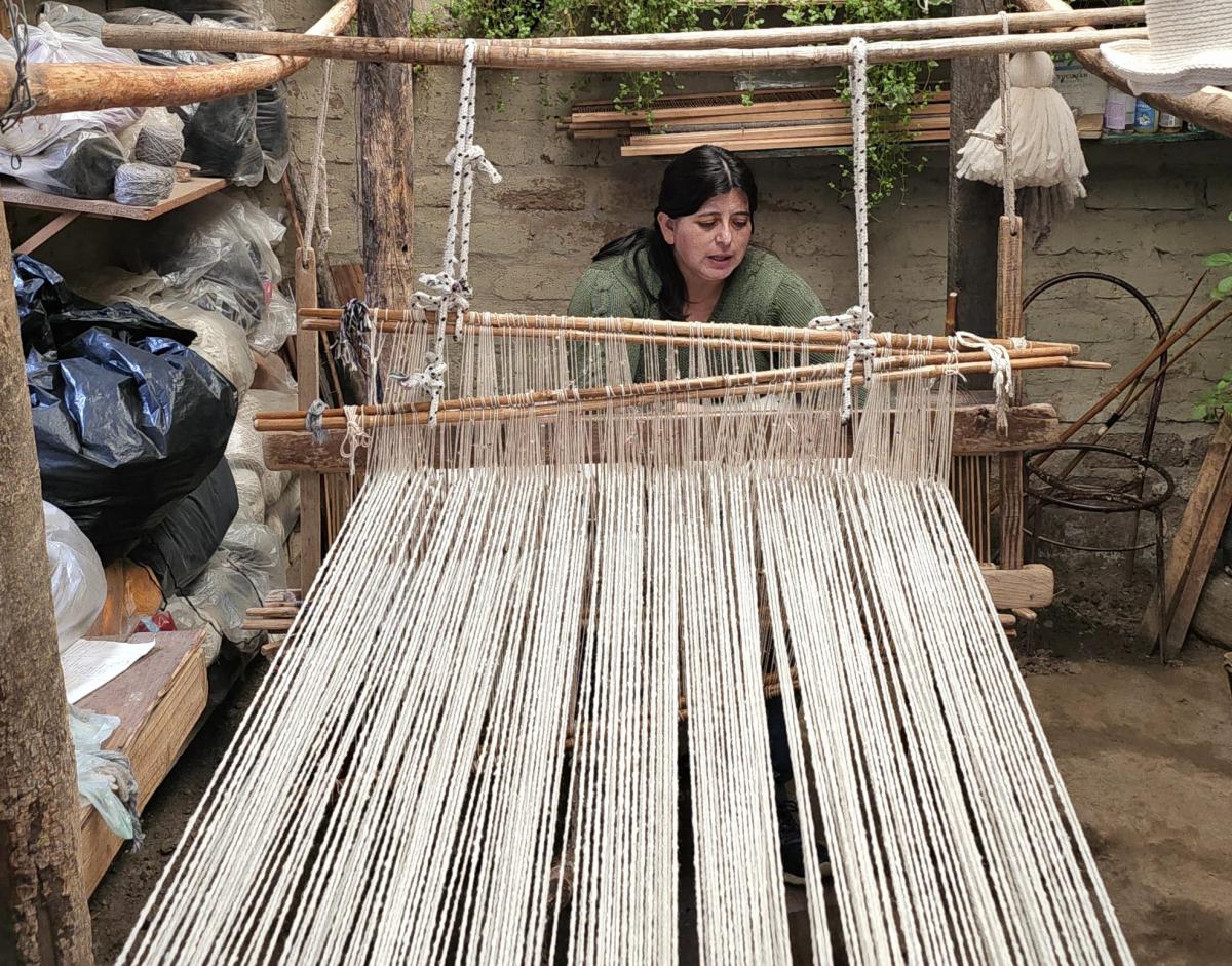 “Trato de mantener lo más tradicional posible a mi taller”, dice. El piso es de tierra y está recién barrido y regado para evitar que los materiales se ensucien con el polvo. Las paredes son de adobe y la que está a sus espaldas tiene repisas repletas de plantas que cuelgan y adornan el lugar. A la derecha está la lana hilada y ovillada, separada por colores; a la izquierda, los tejidos a la venta. El telar de patio con peine que usa Jacinta mide cinco metros de largo y 85 de ancho, está hecho de maderas del lugar y tiene dos pedales abajo. “Yo uso un solo pie porque así me acostumbré, pero lo ideal es usar ambos e ir moviendo el tejido. Mi pantorrilla derecha está más firme que la izquierda por eso”, cuenta entre risas mientras hace la demostración.