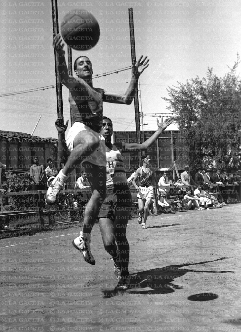 En esta foto de César Martínez Lanio salta tratando de retener la pelota Fariñas, del club Redes Argentinas. Ha quedado atrás de él el jugador Godoy, del Club Huracán. La imagen es de abril de 1936.