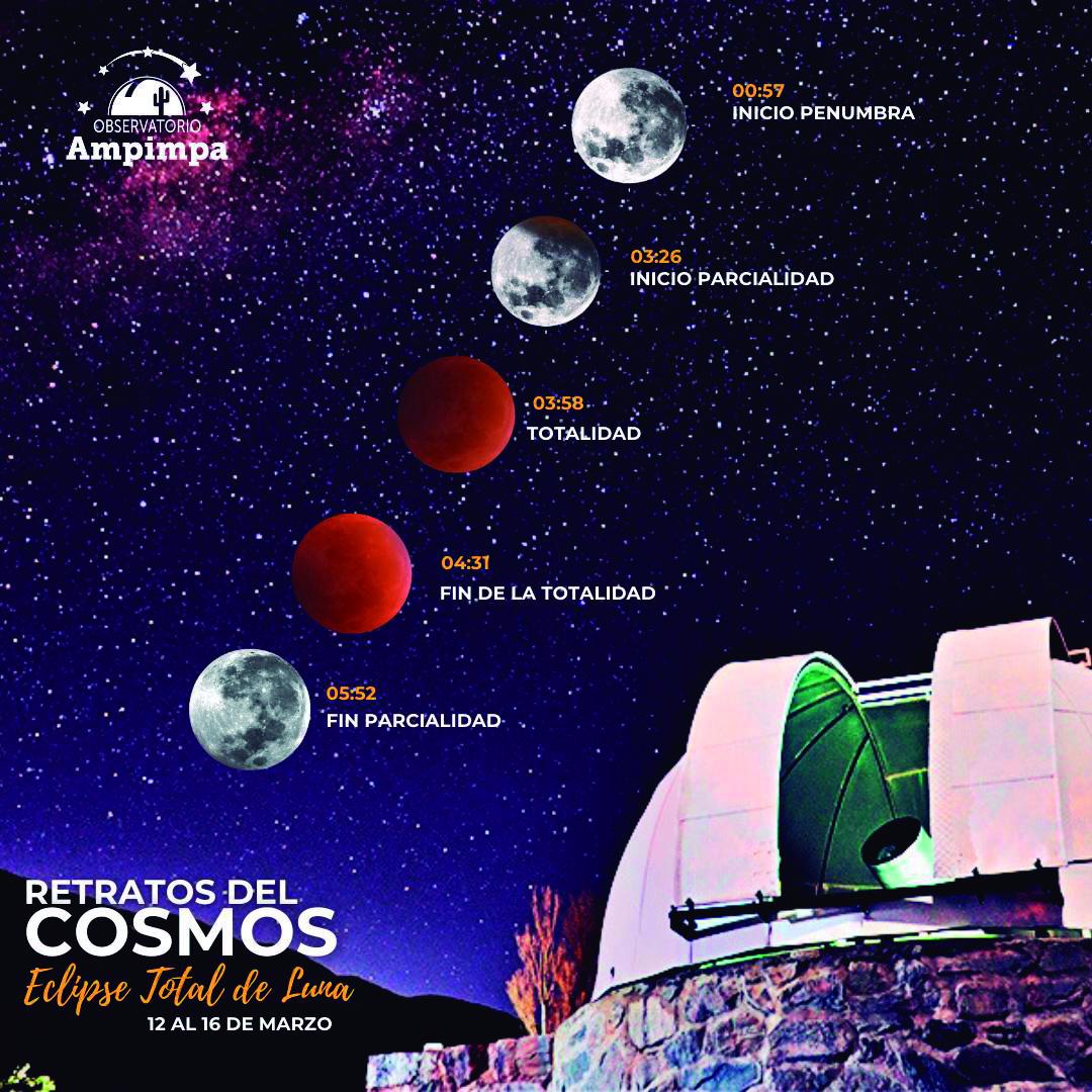 En las primeras horas del próximo viernes 14 de marzo el cielo nos regalará un eclipse total de Luna, un evento astronómico fascinante que podrá observarse en gran parte de América. En Tucumán se podrá observar en forma completa. A la 00.57 del 14, la Luna ingresará en la sombra de la Tierra, adquiriendo un característico tono rojizo. A las 03:58 la Luna alcanzará el punto de mayor oscurecimiento. Este será el mejor momento para observar y fotografiar el fenómeno.