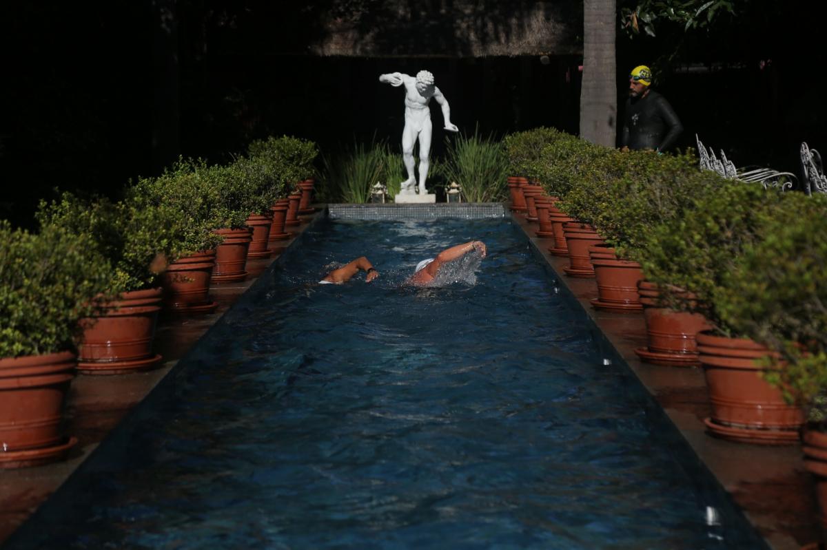 La rutina del entrenador comienza a las 7. La estadía en Buenos Aires no altera su disciplina ni su constancia con el deporte. Espera a que los nadadores se alisten y da inicio a la práctica a las 8:30. Figueroa y Broczkowski son sus discípulos. Lo primero que realizan es un rápido precalentamiento, que incluye ejercicios con la rueda abdominal, saltos a la cuerda y algunas series con mancuernas. Luego, comienza la sesión de nado. La distancia recorrida —o volumen, en términos específicos— varía según el atributo a trabajar. “En esta última semana decidí implementar un mix: un día de técnica, otro de volumen y el restante de intensidad”, explicó.