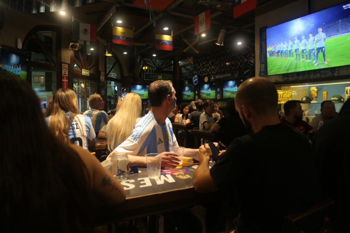 Cuando comenzó el partido entre Argentina y Uruguay, los bares de la zona se fueron llenando de camisetas celestes y blancas. Algunas lucían las tres estrellas, otras eran modelos retro, y no faltaron las que llevaban el nombre de Diego Maradona. Lo curioso era que no todos los que vestían la camiseta eran argentinos.