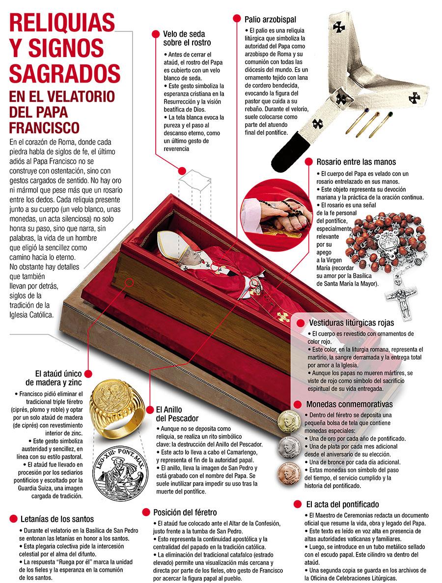 El velorio de un Papa no es solamente un momento de recogimiento y duelo para los fieles católicos del mundo, sino también una ceremonia cargada de signos, símbolos y reliquias que conectan con la misión pastoral del pontífice fallecido y al legado que deja para las generaciones futuras.