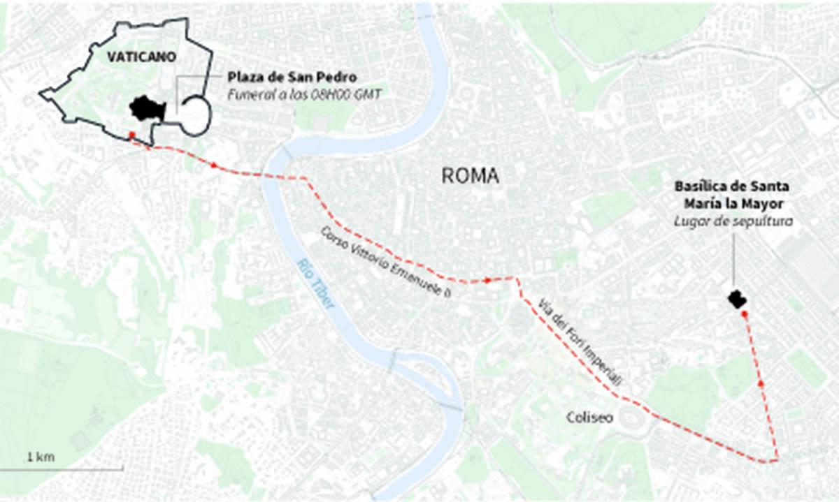 - La caravana pasará por la galería Príncipe Amadeo de Saboya, tomará la avenida Vittorio Emmanuele y llegará a la plaza Venezia, para luego girar hacia los Foros Imperiales. El destino final es la basílica de Santa María la Mayor. Se espera una multitud en El Vaticano, pero también saludando el paso de la comitiva, ya que recorrerá buena parte del casco histórico de Roma.