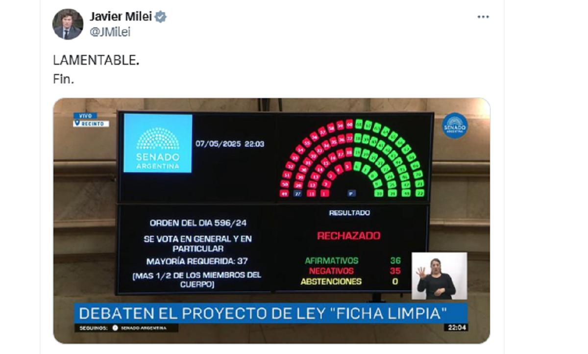 El presidente Javier Milei expresó este miércoles su descontento con la decisión del Senado de la Nación de rechazar la Ley de Ficha Limpia, una iniciativa que buscaba impedir que personas con condenas judiciales en segunda instancia por delitos de corrupción pudieran ser candidatas a cargos públicos. “LAMENTABLE. Fin”, escribió el mandatario en su cuenta de X, tras conocerse el resultado de la votación.