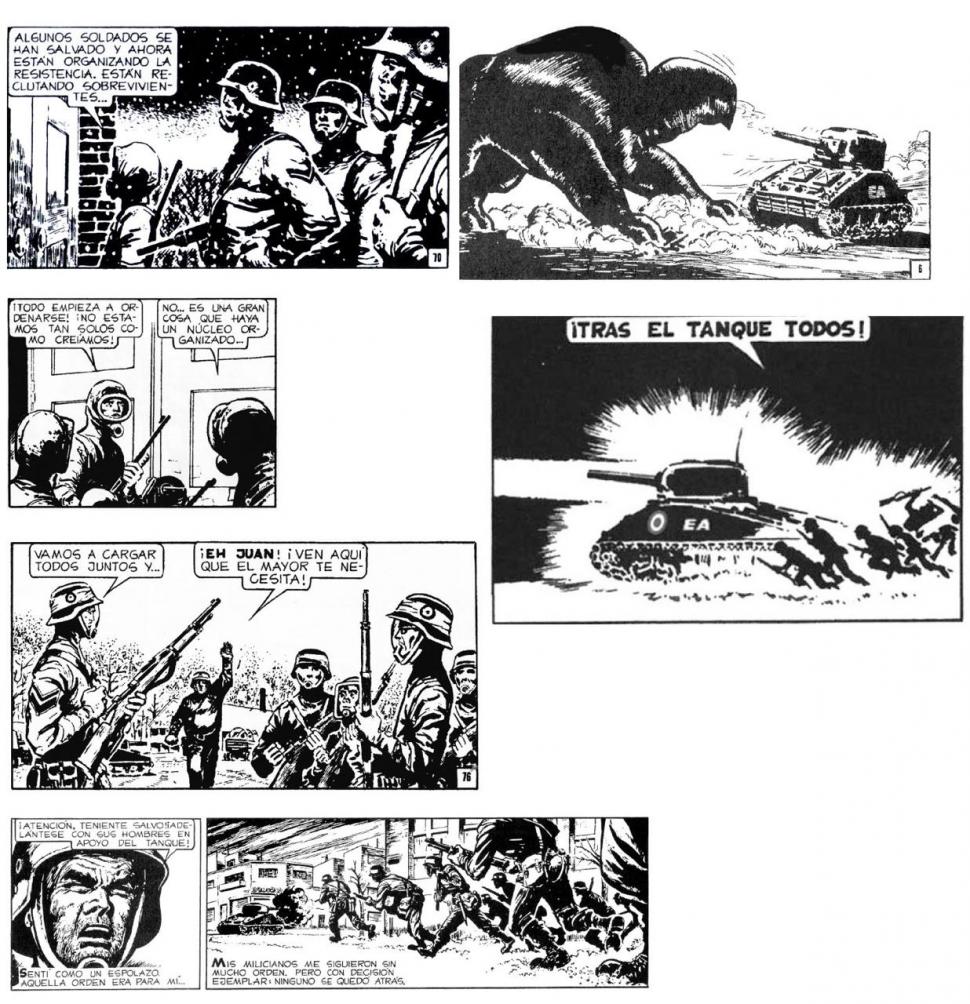 Si abstraemos la pertenencia de “El Eternauta” a la ciencia-ficción, podríamos afirmar que su segunda piel es el de ser una historieta de guerra, el otro terreno donde Héctor Oesterheld, su autor, se movía como pez en el agua. En un gran porcentaje de la extensión de “El Eternauta”, se desarrolla una guerra entre los argentinos y los invasores extraterrestres. Y esa guerra adquiere sus características clásicas, en el momento en que sale a escena el Ejército Argentino, el Ejército que los argentinos habíamos logrado conformar en casi dos siglos de historia, desde las Invasiones Inglesas hasta la nevada mortal alienígena en 1963. Desde el episodio 18 (pág. 70), de enero, hasta el 56 (pág. 217), de septiembre de 1958, es decir, durante 38 episodios y 147 páginas, más del 40 % de toda la historieta, HGO despliega una confrontación bélica entre dos fuerzas armadas en la ciudad de Buenos Aires.