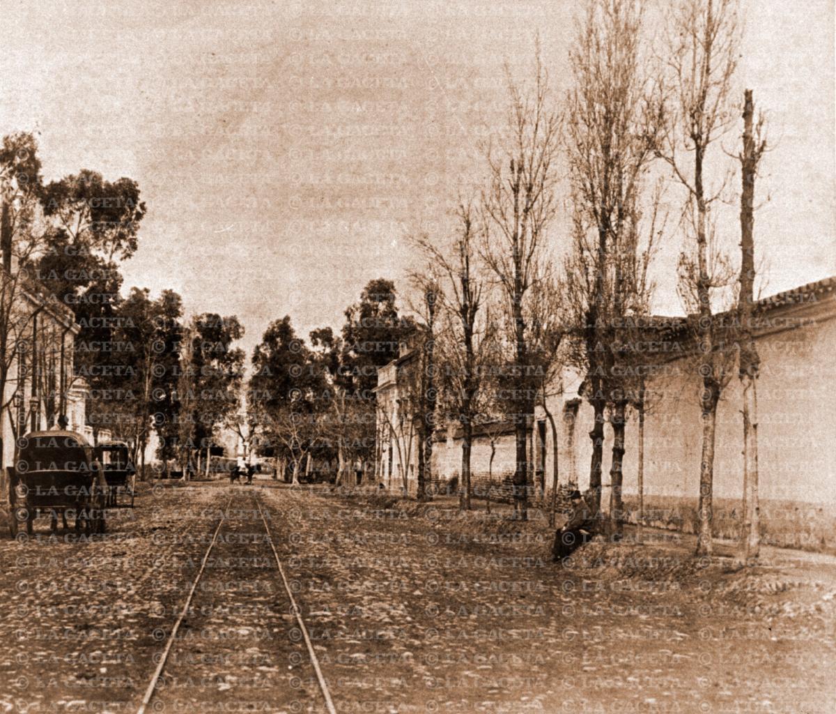 Hay un señor sentado entre los árboles a la derecha de la foto. Hoy tal vez estaría lleno de vendedores ambulantes y al borde habría muchos autos estacionados. Por aquel entonces, a fines del siglo XIX, cuando se inmortalizó esta imagen algunos coches tracción a sangre ocupaban las calles y el centro era propiedad de los vehículos que circulaban sobre las vías. Al fondo se puede ver la pirámide de la plaza Belgrano que ayuda a identificar qué zona de la ciudad es la que está retratada en esta imagen. Se trata de calle Alberdi al 500, llegando al hospital mixto que actualmente es el Hospital Padilla. La designación de esta arteria con el nombre de Alberdi fue el primer homenaje que se hizo en vida y en el país a Juan Bautista Alberdi.