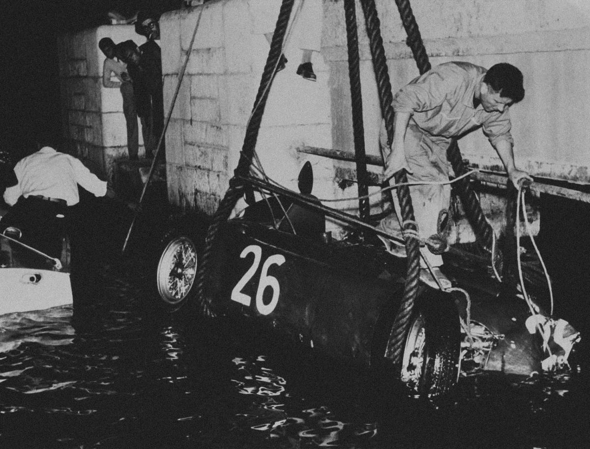 Tras superar la famosa curva Loews, Ascari llegó al sector donde se encuentra la actual chicana del puerto. Allí, una mancha de aceite dejada por el auto averiado de Moss se convirtió en una trampa mortal. El coche número 26 resbaló, atravesó las endebles balas de paja y se precipitó al mar. El vehículo cayó al agua como una piedra y desapareció de la vista de todos. En ese momento, el GP más glamoroso del mundo se transformó en un grito de auxilio: ¡Hombre al agua!