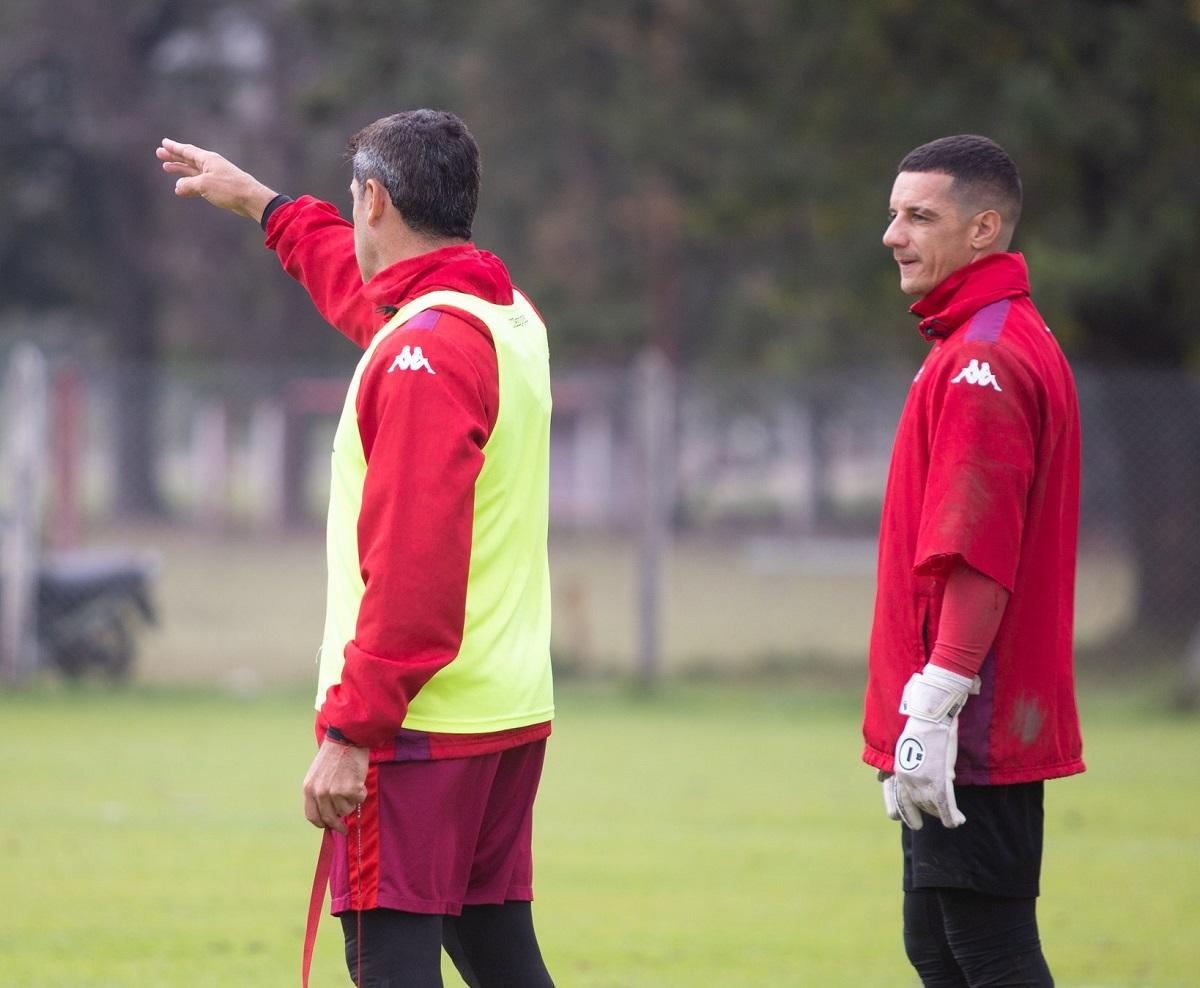 INDICACIONES. Ariel Martos habla con Darío Sand durante la práctica en el complejo Natalio Mirkin. Foto CASM.