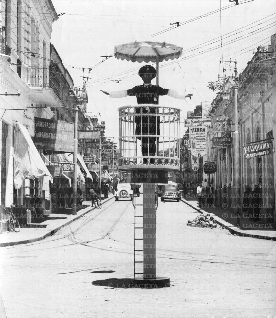 El automovilista circulaba normalmente por las calles de la ciudad cuando, de repente, en una esquina se levantaba una figura casi gigantesca que le hacía señas. Era el varita (denominación ausente en el diccionario) que ayudaba a que el tránsito fluya. A veces sus señas no eran comprendidas y como devolución recibía alguna seña impropia de parte del conductor. Otras veces, el varita detectaba la infracción, tocaba el silbato y empezaba a descender la escalerita. Era una mala señal. Desde su auto, el automovilista miraba por el espejo retrovisor y veía al agente de tránsito anotando la patente, mientras tocaba el silbato y bajaba a las apuradas. Toda una escena de malabarismo circense. Con el tiempo el semáforo se fue haciendo cargo de todas estas tareas y las discusiones fueron otras. La foto que seleccionó para esta oportunidad Jorge Olmos Sgrosso recrea aquellas vivencias. Corresponde a una garita que se colocó en la intersección de 24 de Septiembre y avenida Avellaneda en 1940. Por aquel entonces, la policía pidió la instalación de estas estructuras y fueron las firmas comerciales las que hicieron el aporte y donaron las garitas para que el tránsito funcionara mejor en las calles de Tucumán. Las veredas “tomadas” por los negocios y comerciantes ocasionales confirman que se trata de un paisaje al que siempre nos tuvo acostumbrado El Bajo.