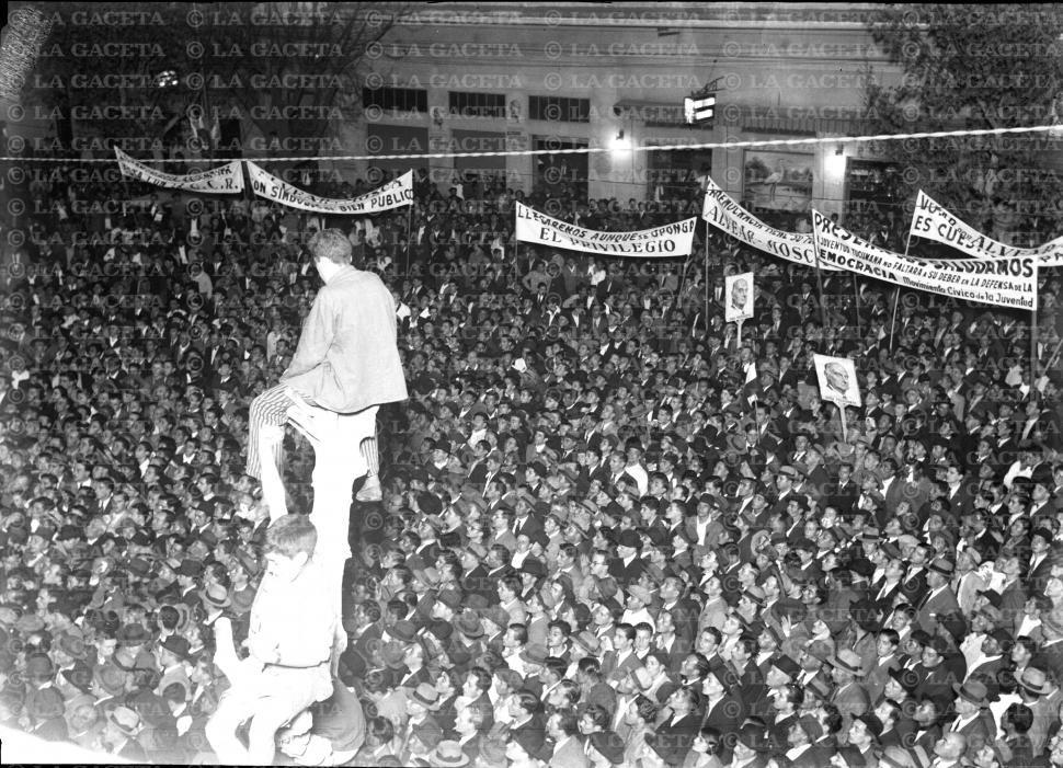 “Llegaremos aunque se imponga el privilegio”. “La juventud de Tucumán no faltará a su deber en la defensa de la democracia”. Esas frase rezan las pocas pancartas que asoman en el acto político de junio de 1937. Las calles tucumanas se muestran atestadas de fanáticos con moños, boinas, corbatas y sombreros que confirman las costumbres de la época. También están los jóvenes intrépidos que se trepan a las columnas de alumbrado para tener una vista privilegiada del acto del ex presidente argentino Marcelo Torcuato de Alvear, quien vino especialmente a Tucumán para ese acto proselitista.