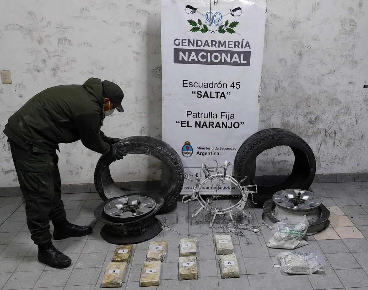 En presencia de testigos, los efectivos desarmaron las ruedas y extrajeron ocho “panes” y dos paquetes amorfos que sometidos a la prueba de campo Narcotest que arrojó resultado positivo para cocaína, arrojando un peso total de 10 kilos 523 gramos.
