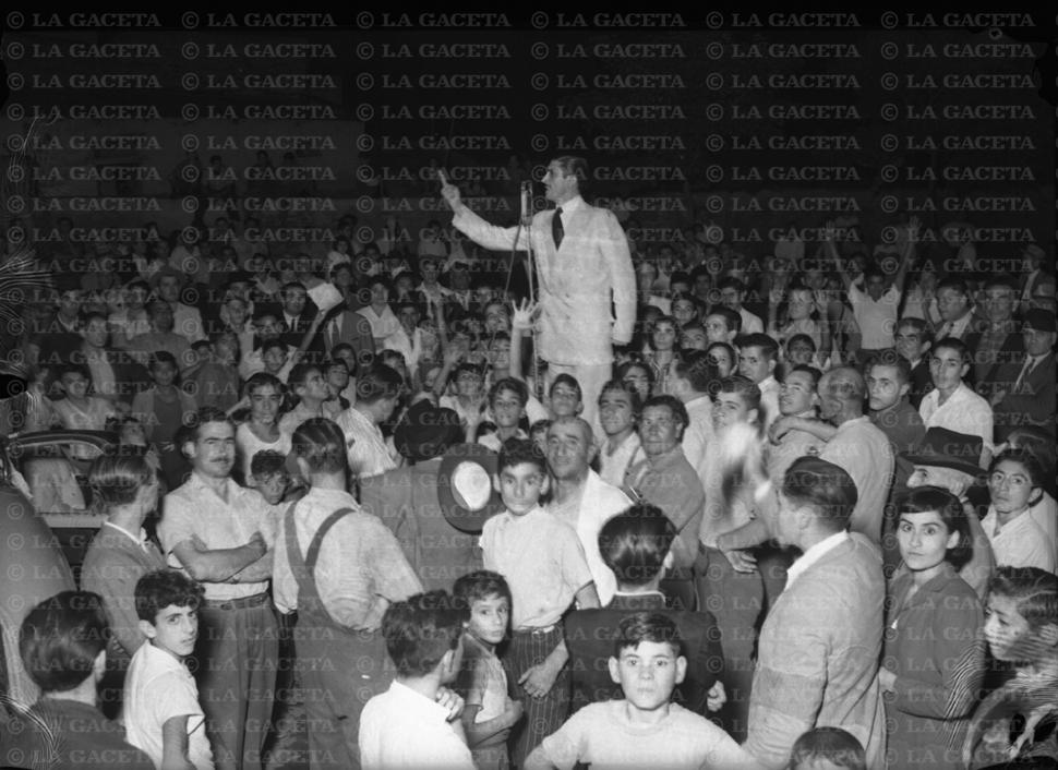 Ángel Gerardo Pisarello en un mitin radical en la esquina de las calles San Juan y Asunción. El “Flaco”, afiliado a la Unión Cívica Radical, fue un activo militante político, convencional constituyente en 1949 y senador provincial en 1950. Tras el golpe de Estado de 1976 fue el único abogado defensor de presos políticos en Tucumán; presentó gran cantidad de hábeas corpus para detenidos-desaparecidos, hecho que le valió reiteradas amenazas y un atentado con dos bombas en su casa familiar. El 24 de junio de 1976 fue secuestrado por un grupo de tareas frente a su familia en su casa. Apareció torturado y muerto el 1 de julio, en Santiago del Estero. La fotografía corresponde a una publicación de LA GACETA del viernes 24 de febrero de 1950, página 5, en el marco de una nota que describe varias reuniones radicales realizadas en distintas ciudades e ingenios azucareros de Tucumán.