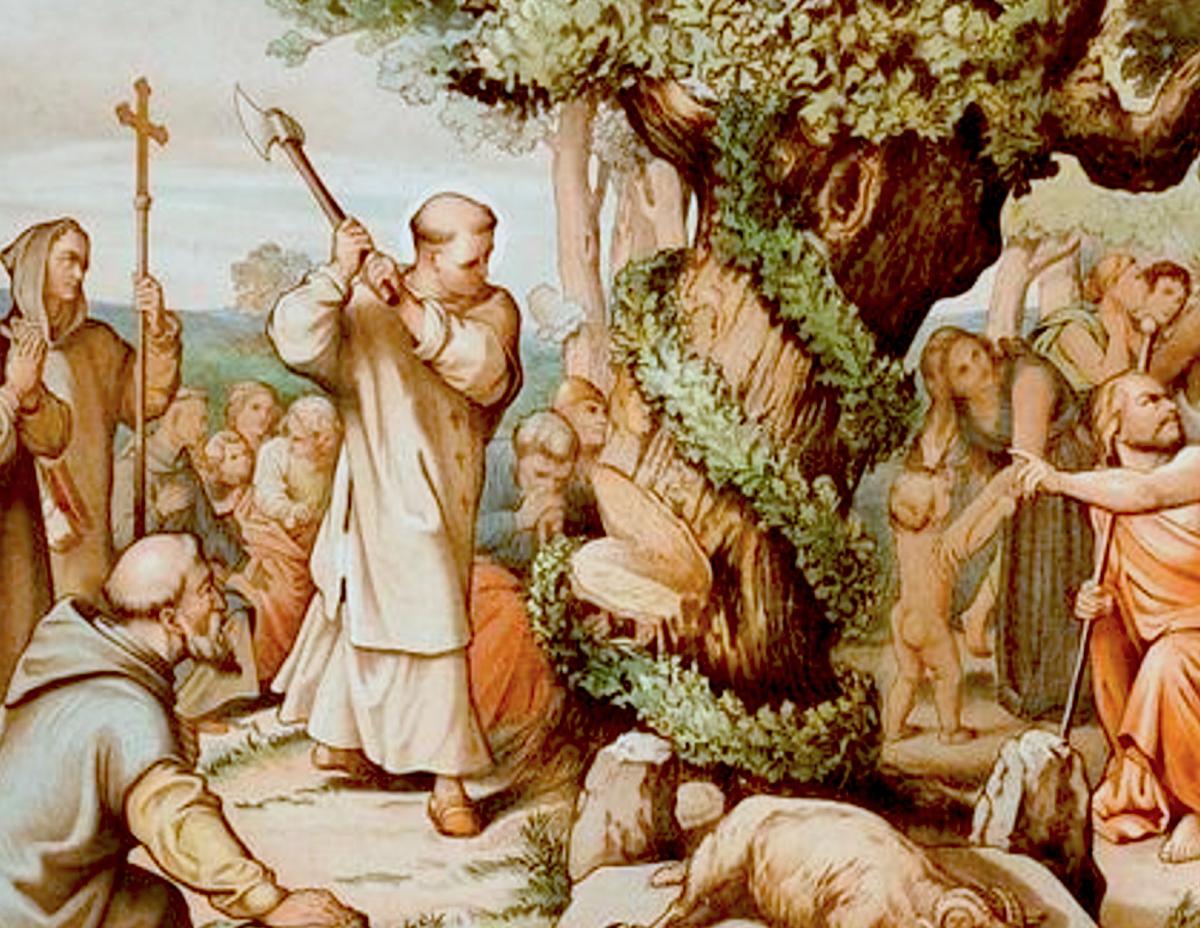 Una de sus acciones más emblemáticas ocurrió en Geismar, en el año 723, cuando impidió un sacrificio humano al dios pagano Thor. Interrumpió el ritual, salvó a un niño y destruyó el roble sagrado con un hacha, proclamando la superioridad de la cruz de Cristo sobre los falsos dioses. En su lugar, levantó una capilla y propuso al pequeño abeto como símbolo cristiano, dando origen a la tradición del árbol de Navidad. Esta intervención marcó un hito en su lucha contra el paganismo y en la instauración de nuevas costumbres cristianas.