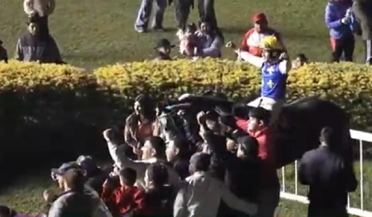 FESTEJO. El jinete José Alfredo Vizcarra, que le brindó una acertada conducción a Cima Himalaya, celebra la victoria junto a los seguidores del stud “Monterrico”.