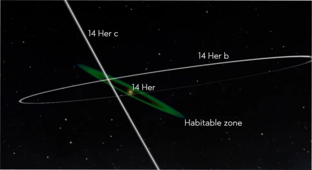 A diferencia de las órbitas planas y ordenadas de los planetas de nuestro sistema solar, el sistema 14 Herculis está drásticamente desalineado. Sus dos planetas conocidos, incluido 14 Her c, orbitan en ángulos de unos 40 grados entre sí, creando un patrón de cruce en forma de "X" alrededor de su estrella.