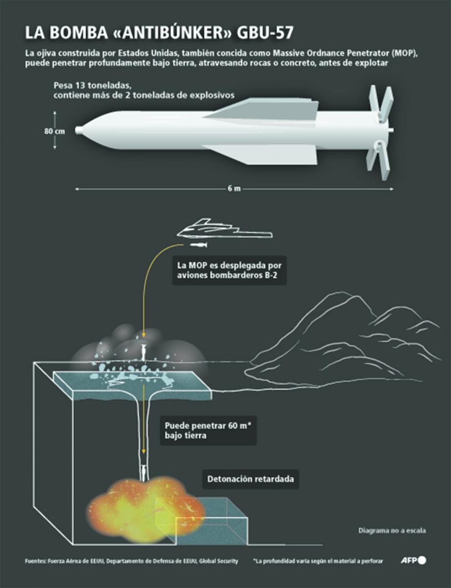 VIENA, Austria.- Frente al tono triunfalista de Estados Unidos tras el ataque lanzado el sábado en Irán, el Organismo Internacional de Energía Atómica (OIEA) exige acceso a los sitios afectados, y los expertos se abstienen de sacar conclusiones apresuradas. Muchas preguntas siguen sin respuesta, especialmente en torno al paradero del stock de uranio enriquecido al 60%. Para atacar el programa nuclear de Irán, Estados Unidos utilizó por primera vez una potente bomba antibúnkeres, la única capaz de destruir instalaciones a gran profundidad. Se trata de la GBU-57, una ojiva de 13 toneladas, capaz de hundirse a decenas de metros bajo la superficie antes de explotar. La GBU-57 “fue diseñada para penetrar hasta 200 pies (61 metros) bajo tierra antes de explotar”, señala el ejército estadounidense.