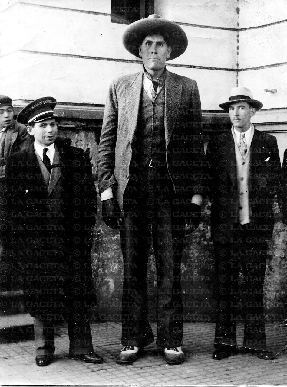 El boliviano Manuelito Camacho impresionaba con sus dos metros y 22 centímetros de altura. Tenía 35 años, lo llamaban “el rascacielos humano” y en julio de 1936 se presentó varios días en Tucumán en el cine Moderno (en calle 9 Julio primera cuadra). Había peleado en exhibición con Luis Ángel Firpo pero era un gigante sonriente y bondadoso, amigo de los niños e incapaz de provocar enfrentamientos, cuenta Carlos Páez de la Torre (h) en una de sus “Crónicas de antes”. En la edición de LA GACETA del 5 de julio del 36 se publicó una página de su visita al diario, que Gustavo Grupalli seleccionó junto con la foto central, que muestra su altura.