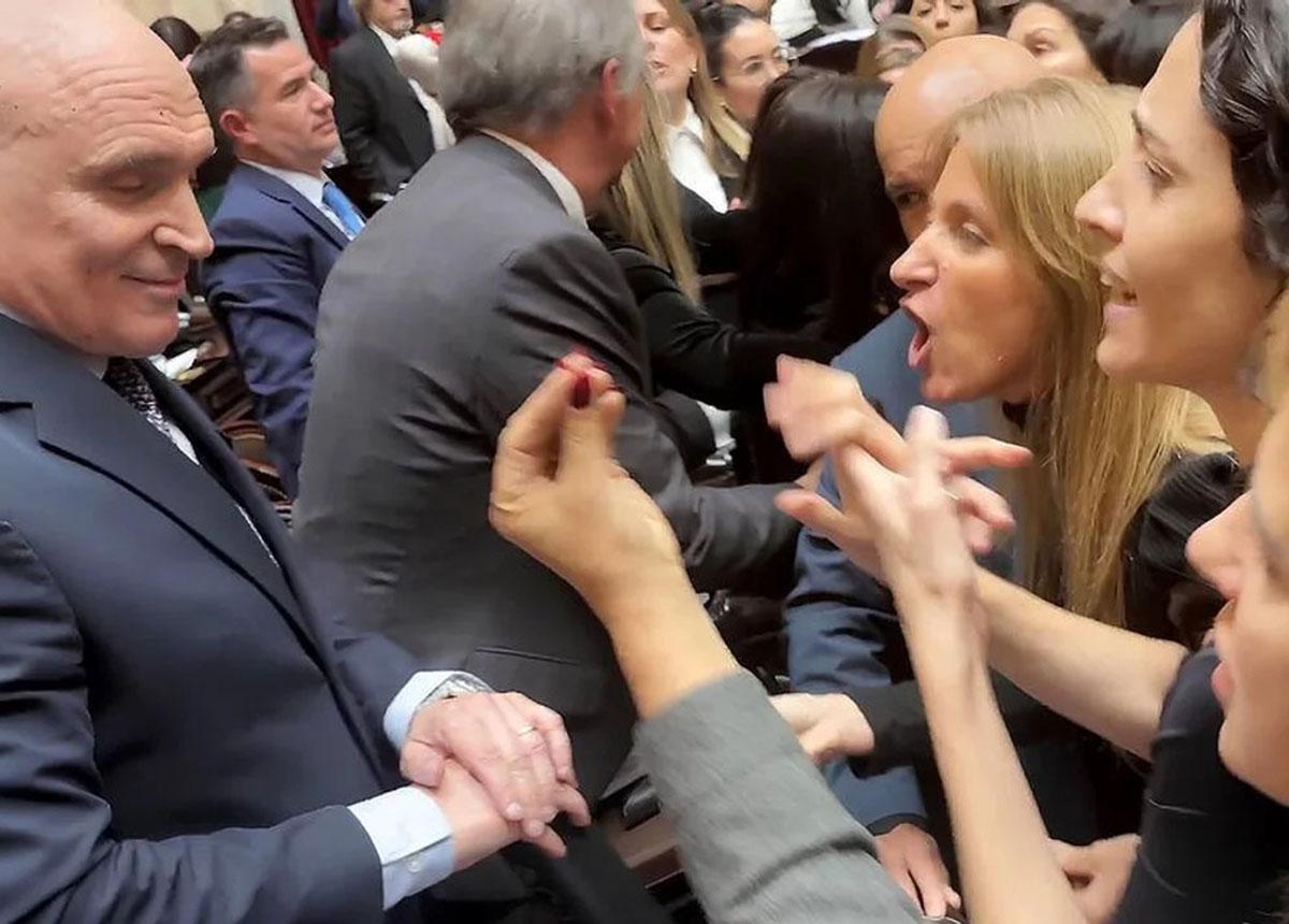 La moción despertó una nueva discusión reglamentaria y el oficialismo se movió para que esa votación se haga sobre el final de la sesión. Con el bloqueo de la votación el clima en el recinto se fue tensando. Cruces por el juicio de YPF y opiniones divididas sobre el conflicto armado entre Israel e Irán empezaron a escucharse de uno y otro lado del recinto. El punto de mayor tensión se vivió cuando el kirchnerismo cuestionó las detenciones de las militantes que vandalizaron la casa del diputado Espert. Dirigentes camporistas como Paula Penacca y Lorena Pokoik fueron directamente a increpar al dirigente bonaerense. En medio de un escándalo con gritos y hasta empujones, la sesión se levantó por falta de quórum.