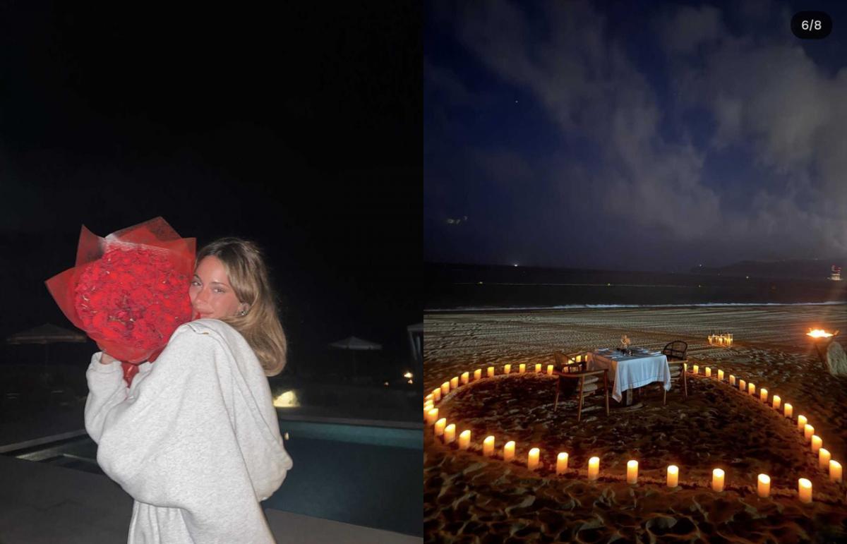 Una mesa amplia para dos personas con manteles blancos y un vestido en color a juego. Vasos, copas, velas iluminando la mesa. De fondo, la playa, el mar y encima, las estrellas y el cielo nocturno. En torno a los dos, un enorme corazón dibujado con velas sobre la arena. Infaltables: las rosas rojas del enorme ramo que recibió la cantante.