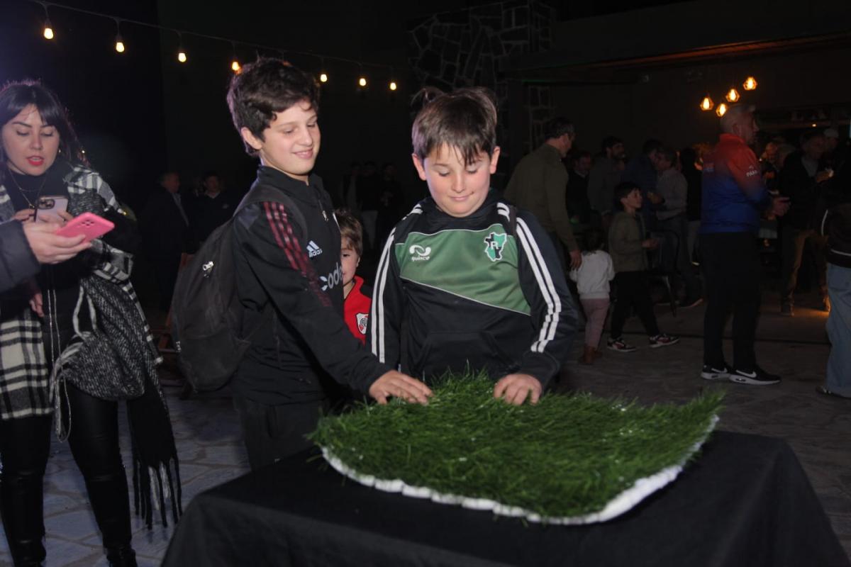 Un anticipo de lo que será la nueva cancha, literal, fue depositado delante de todos los presentes. Los capitanes Simón Pfister y Roque Delloca, de las divisiones M-17 y M-16, respectivamente fueron los encargados de poner a la par del documento de firma las champas de pasto sintético que la empresa llevó de muestra. Pocos de los presentes las conocían.