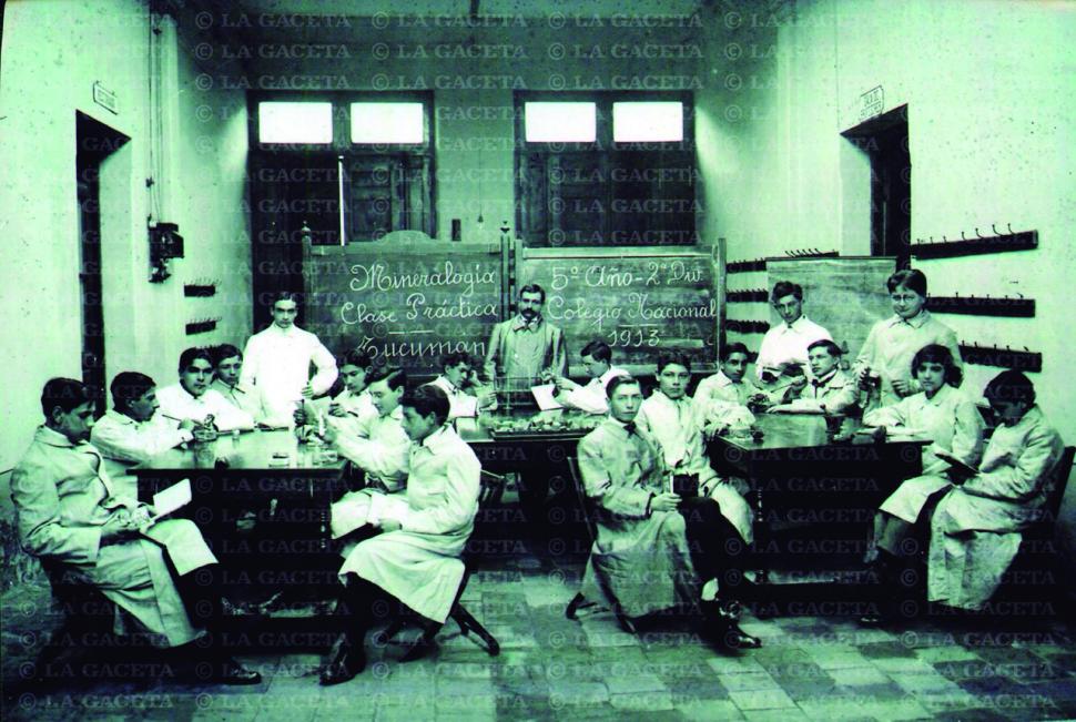 La foto “alumnos en el Colegio Nacional, 1913” que separó Jorge Olmos Sgrosso, es de una de las instituciones educativas centrales en el Tucumán de comienzos del siglo XX. Se ve allí a 18 alumnos de 5° año segunda división en la clase práctica de Mineralogía. Según describe Rodolfo Cerviño en “Del Colegio San Miguel al Colegio Nacional”, en ese curso hubo 40 estudiantes, entre los que se encontraban María Teresa Saleme, Sisto Terán (h), Juan Carlos Cossio, Benigno Vallejo, Julio Prebisch, Raúl Frías Silva, Luisa Fauvarque, María Azcoaga, Eduardo Sabaté, Oscar y Eugenio Parajón Ortiz, Emilio Orphee, Emilio Porté, Ramón D. Paz Posse y Pablo Rojas Paz.