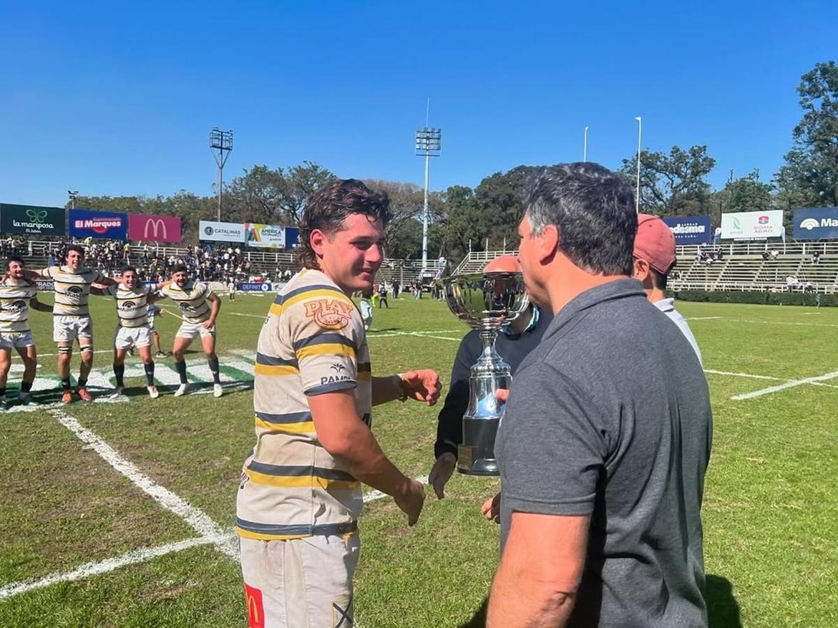 MOMENTO CÚLMINE. Benjamín Heredia, capitán de Lawn Tennis, recibe la copa de Intermedia de manos de directivos de la Unión de Rugby de Tucumán. Prensa URT