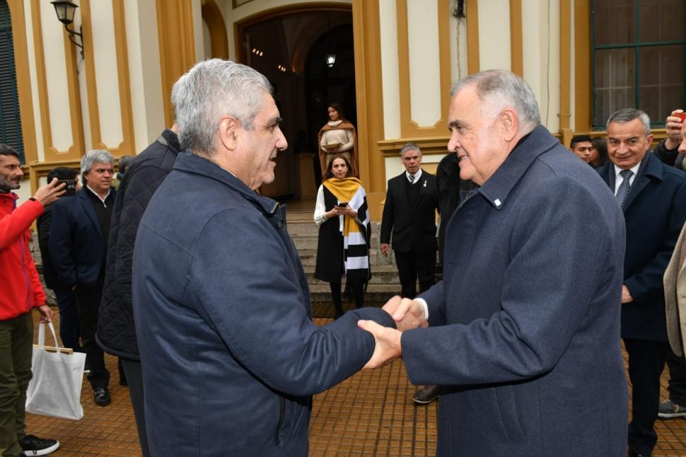 EN EL COLMENAR. Jaldo saluda al ministro de Economía, Daniel Abad, al llegar a la Estación Experimental, para encabezar el acto de aniversario.