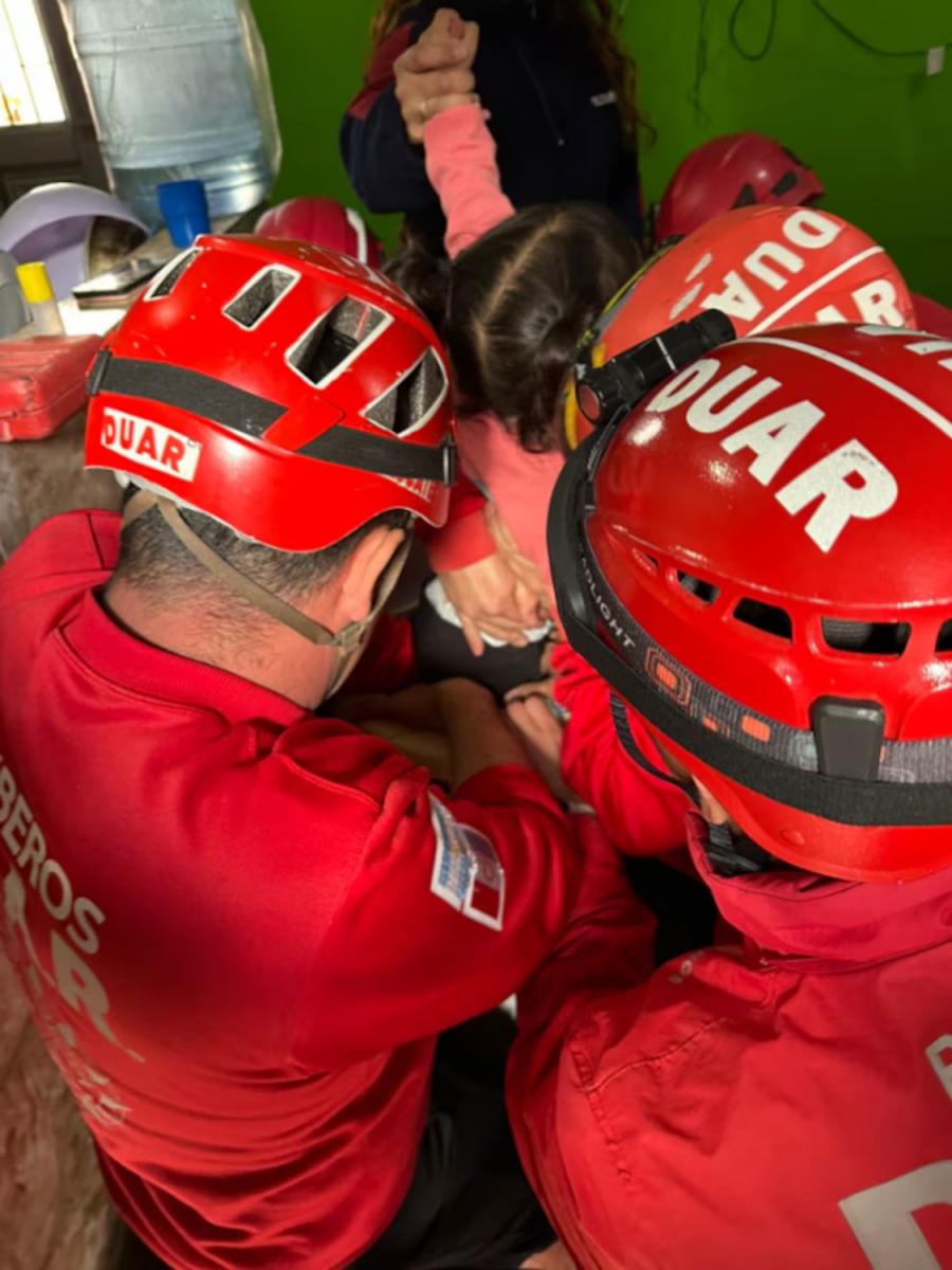 Los bomberos verificaron que la niña se encontraba consciente, pero con signos de angustia y dificultad para moverse. Durante cinco minutos realizaron maniobras controladas para liberar, primero, su torso y luego sus extremidades, evitando causarle daño. La madre acompañó todo el procedimiento conteniendo emocionalmente a su hija.