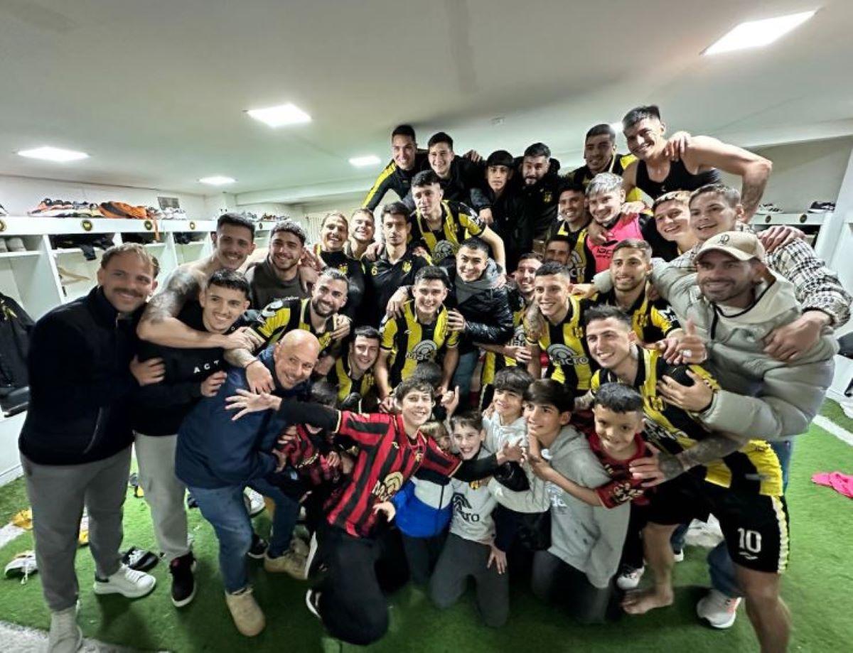 FUERTES. Los jugadores de Deportivo Madryn, conscientes de haber derrotado a un candidato, festejaron en el vestuario FOTO DE @ClubMadryn