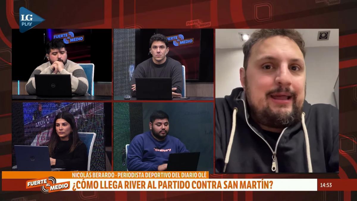 El periodista Nicolás Berardo, que sigue la campaña de River para el diario Olé, pasó por “Fuerte al medio”, la propuesta deportiva de LG Play, y dejó un panorama detallado sobre el presente del “Millonario” de cara al duelo de mañana contra San Martín por los 16avos de final de la Copa Argentina.