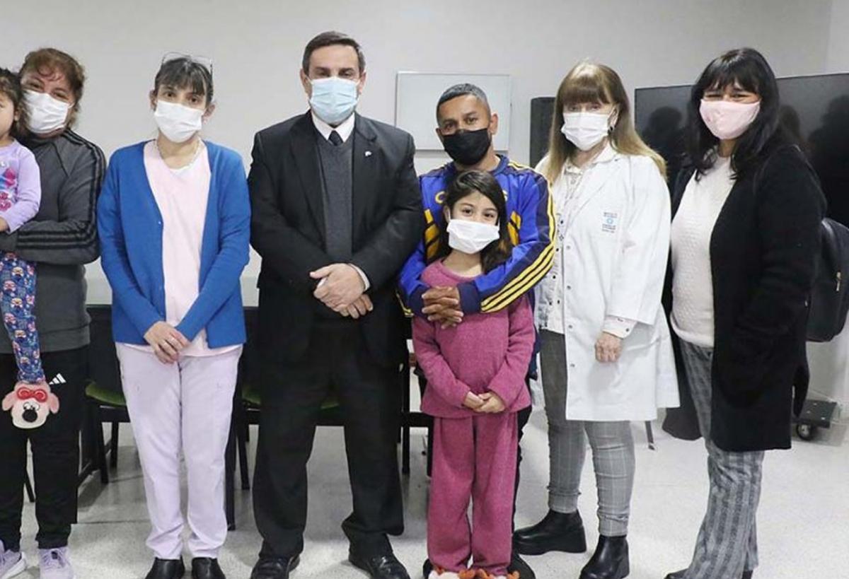 DE ALTA. La familia que sufrió el accidente el moto, junto a las autoridades, antes de recibir el alta de las dos niñas. COMUNICACIÓN TUCUMÁN