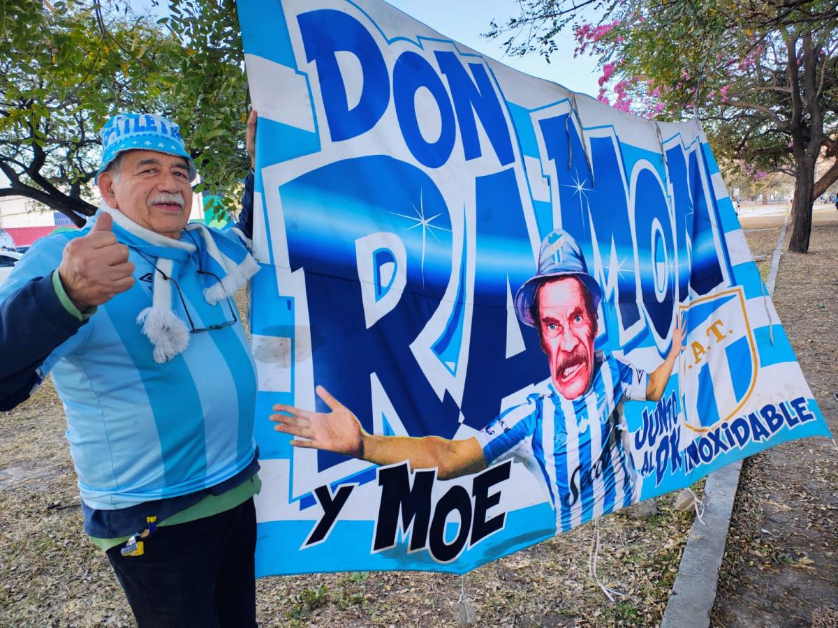 Ramón Véliz tiene más de 70 años, es jubilado, pero nada de eso lo detiene para seguir a Atlético a donde juegue. Este martes, en la previa del partido por Copa Argentina frente a Newell’s, colgó en la tribuna preferencial del estadio Padre Ernesto Martearena una bandera muy especial: el rostro de “Don Ramón” del Chavo del 8, sobre el cuerpo del ídolo Luis Miguel “Pulga” Rodríguez.