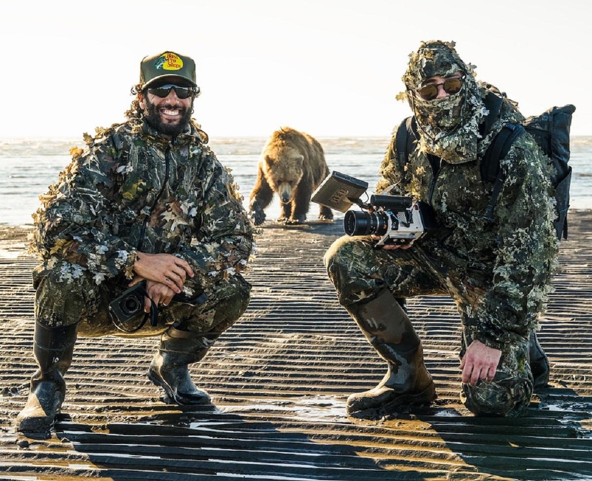 NUEVA FACETA. Ricciardo (izquierda) posa junto al creador digital Jack Berg, con camuflaje y una barba prominente delante de un oso.