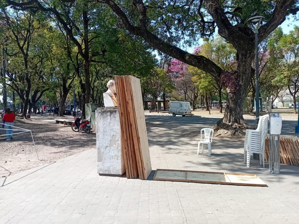 LAMENTABLE. Los puesteros utilizan la cabeza de Nicolás Avellaneda para sostener tablones cuando arman la feria. LA GACETA / FOTOS DE GUILLERMO MONTI