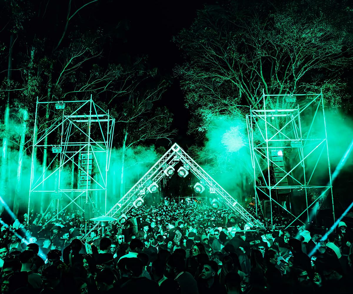 FIESTA ELECTRÓNICA. El Bosque Atahualpa Yupanqui se transformó en escenario de una noche que combinó naturaleza, tecnología y la música de Facundo Mohrr y Agustín Giri. / GENTILEZA DE PROYECTO ABORIGEN