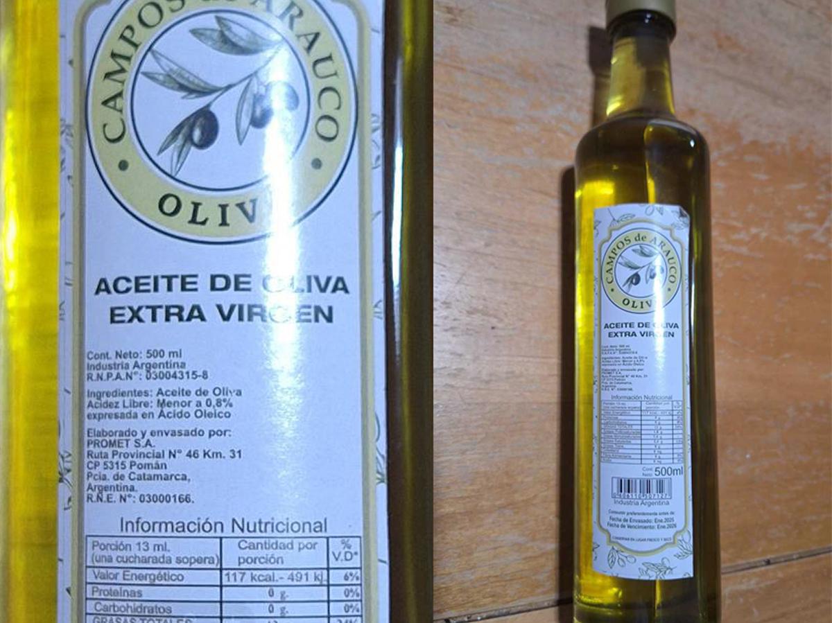 El primero de los productos prohibidos está rotulado como “‘Aceite de oliva extra virgen marca Campos de Arauco - Oliva’, RNPA N° 03004315-8, RNE N° 03000166”. La medida fue oficializada en la Disposición N°6677/25 y fue impulsada por carecer de registros de establecimiento y producto y por exhibir un rótulo con registros sanitarios que no pertenecían a la marca que registraba.