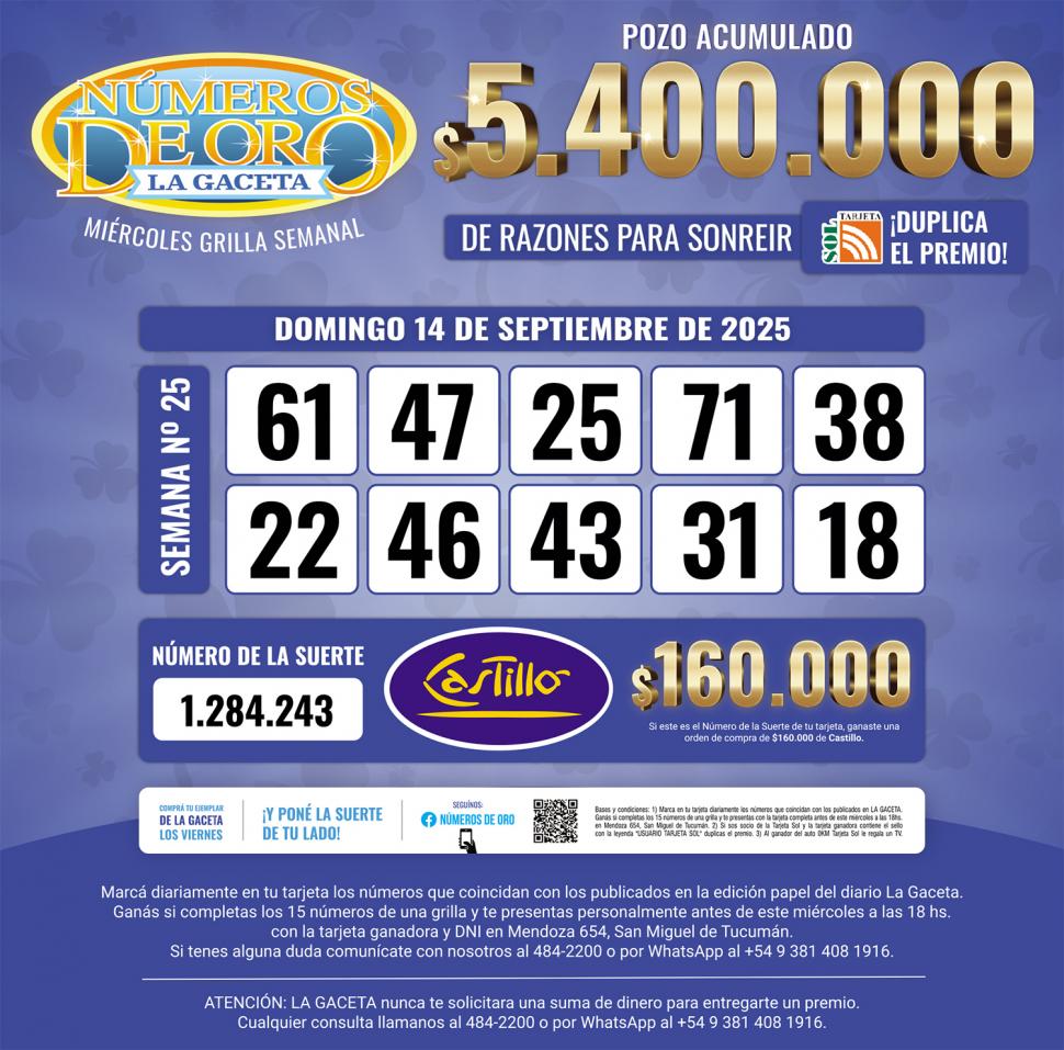 Los Números de Oro de LA GACETA del domingo 14 de septiembre de 2025