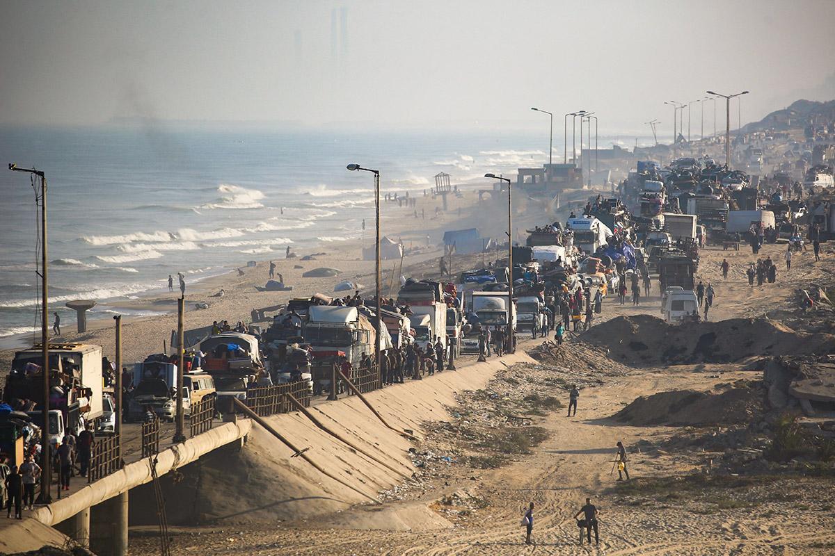 ÉXODO. A pie o en vehículos, miles de palestinos cargan sus pertenencias y huyen desde Nuseraat hacia el sur.