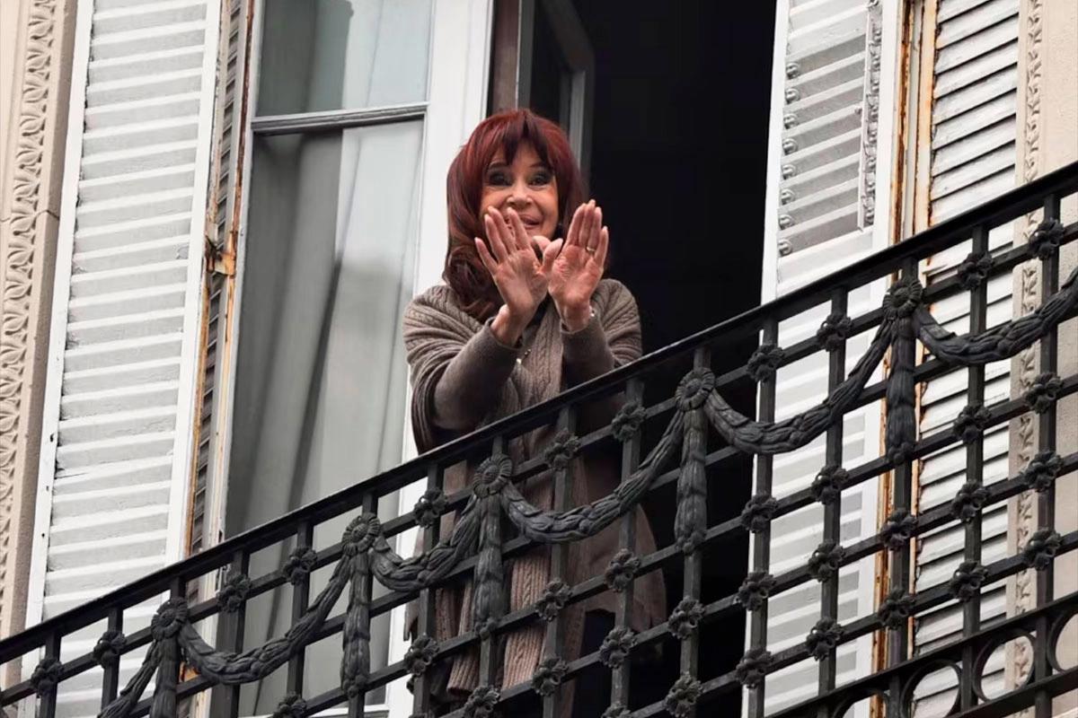 EN EL BALCÓN. Cristina Fernández de Kirchner saluda a militantes desde el departamento del barrio porteño de Constitución, donde está detenida.